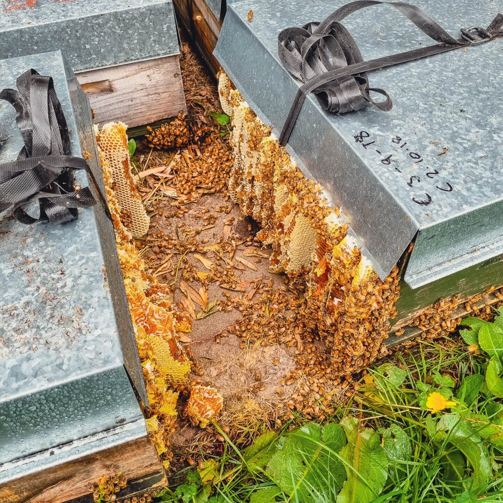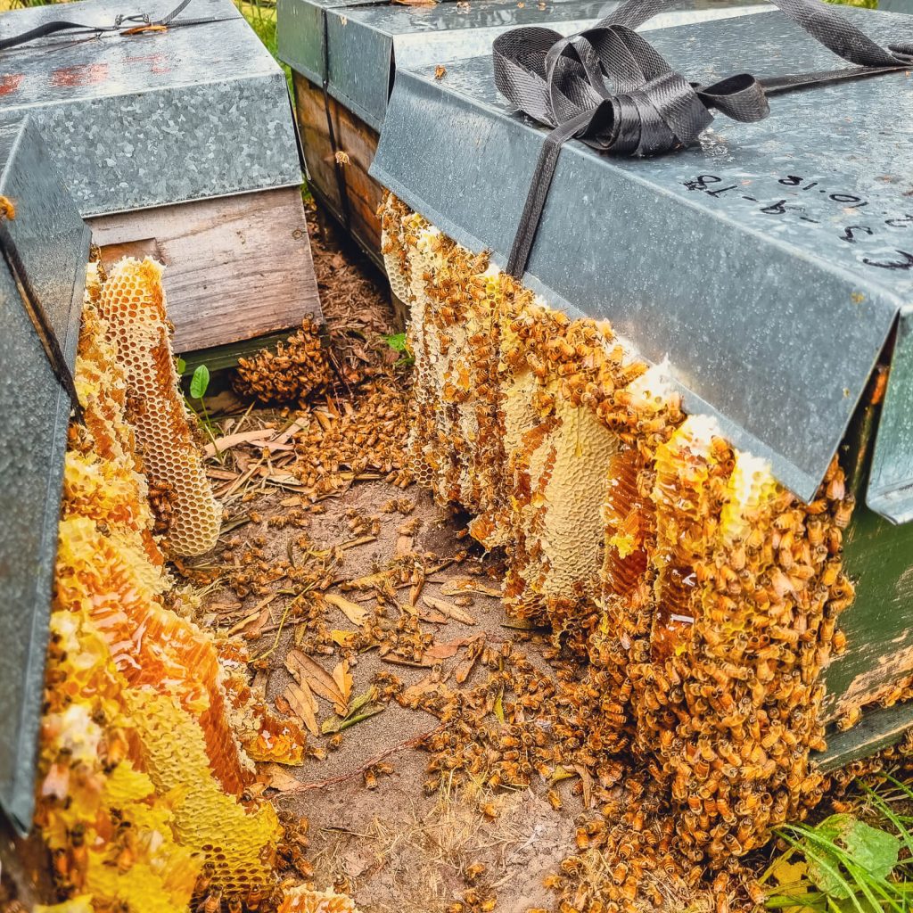 At the end of the honey season when we were about to move hives we got a surprise! The bees had been so busy they ran out of room in the hive and started building honeycomb on the outside!