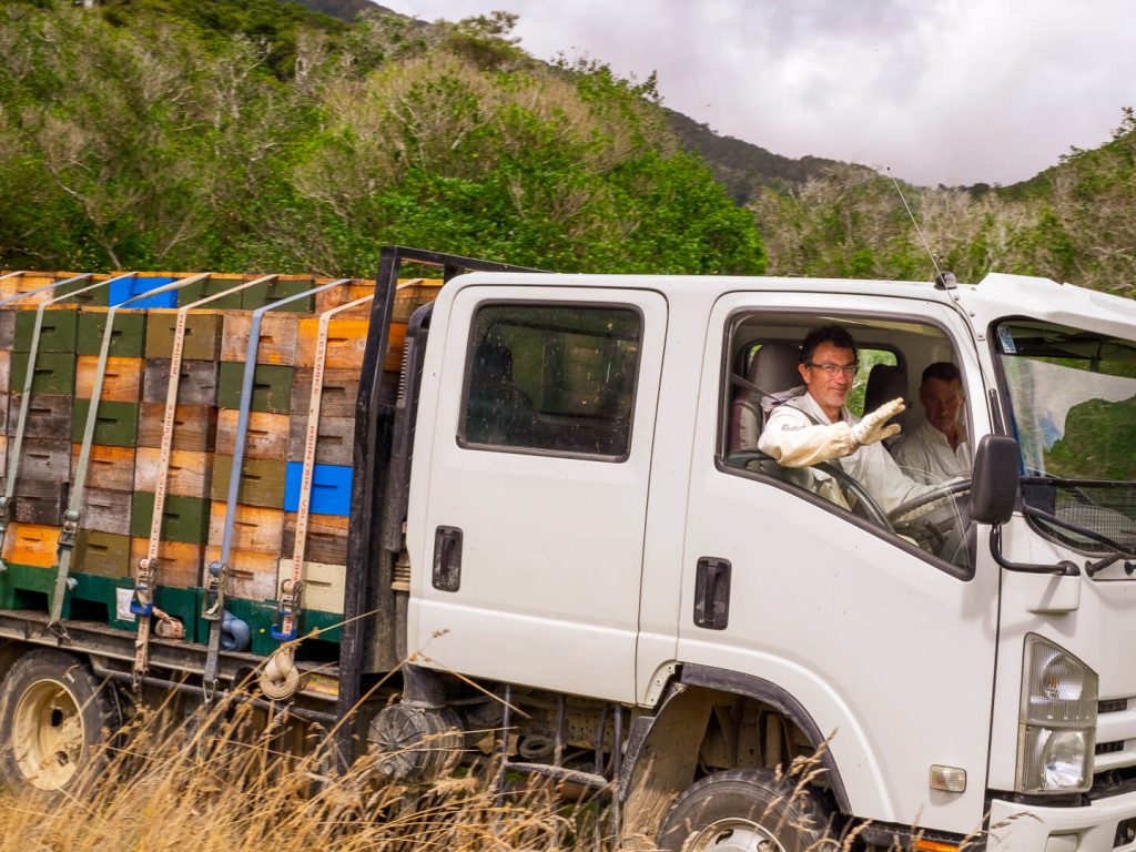 The first of the honey boxes have already made their way to the extraction shed, and the whole place is perfumed with the rich scent of Kāmahi — the first honey of our season. The aroma makes Nicky particularly happy. She says she loves the way kāmahi looks when it pours: “Kāmahi has a special golden colour and just seems to glow as it pours into the jars.” Everyone on our team has their favourite honey, and Nicky’s is definitely Kāmahi.