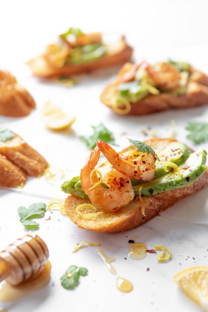 - To assemble, top the slices of French stick with the avocado then prawns. Sprinkle the chili flakes on top and add a squeeze of lemon to each. Add the zest, salt and coriander then serve immediately.