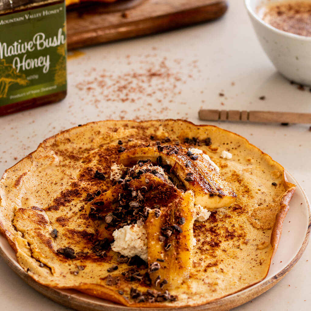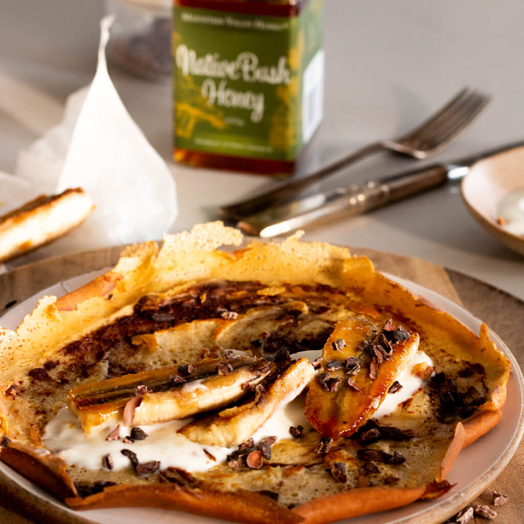 Serve Crêpes with ricotta, Native Bush Honey caramelised banana and drizzle over with Chilli Chocolate.