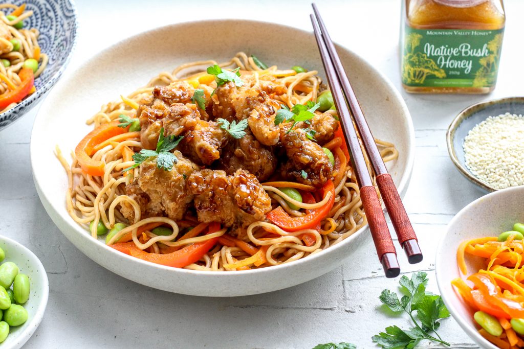 Honey Soy Noodles with Crispy Chicken Recipe with Native Bush Honey