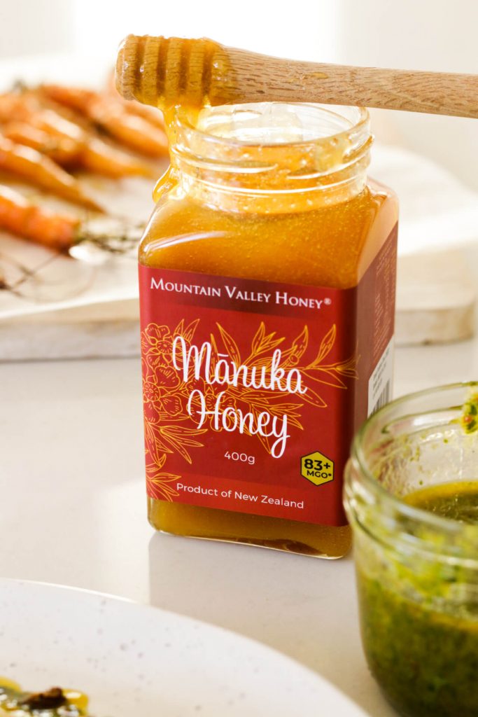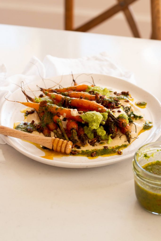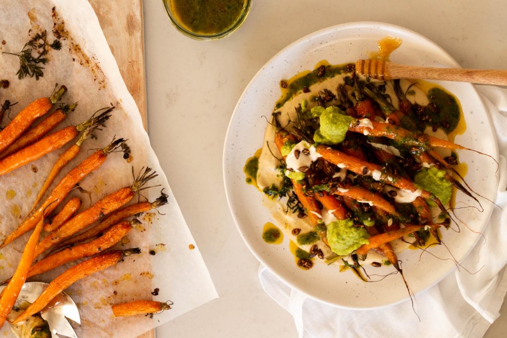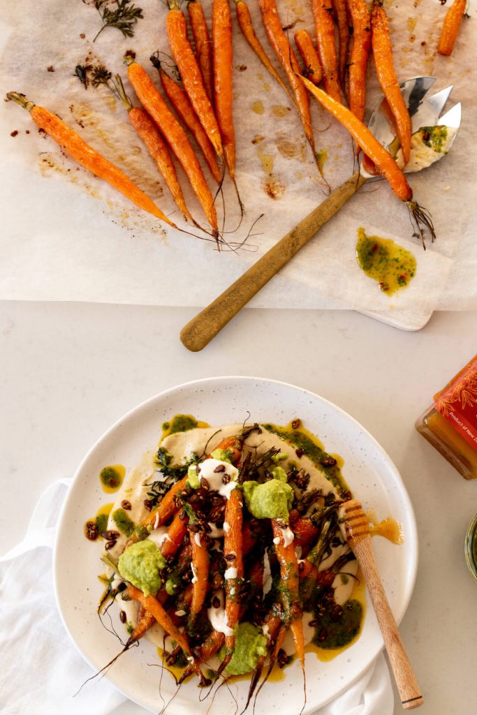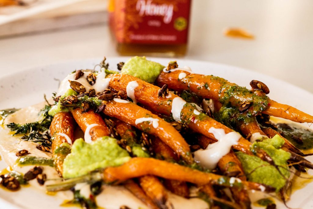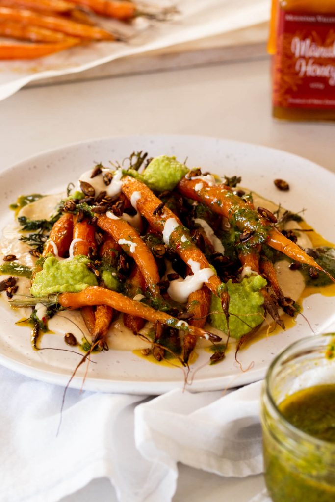 Roasted Baby Carrots Recipe with Mānuka Honey Tahini Sauce & Chilli Herb Oil