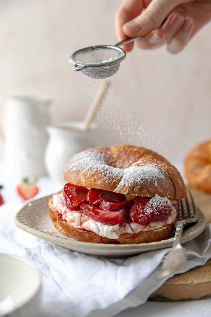 - Distribute the whipped ricotta between the croissants and top with the roasted strawberries. Drizzle extra juices and honey over the top and serve immediately.