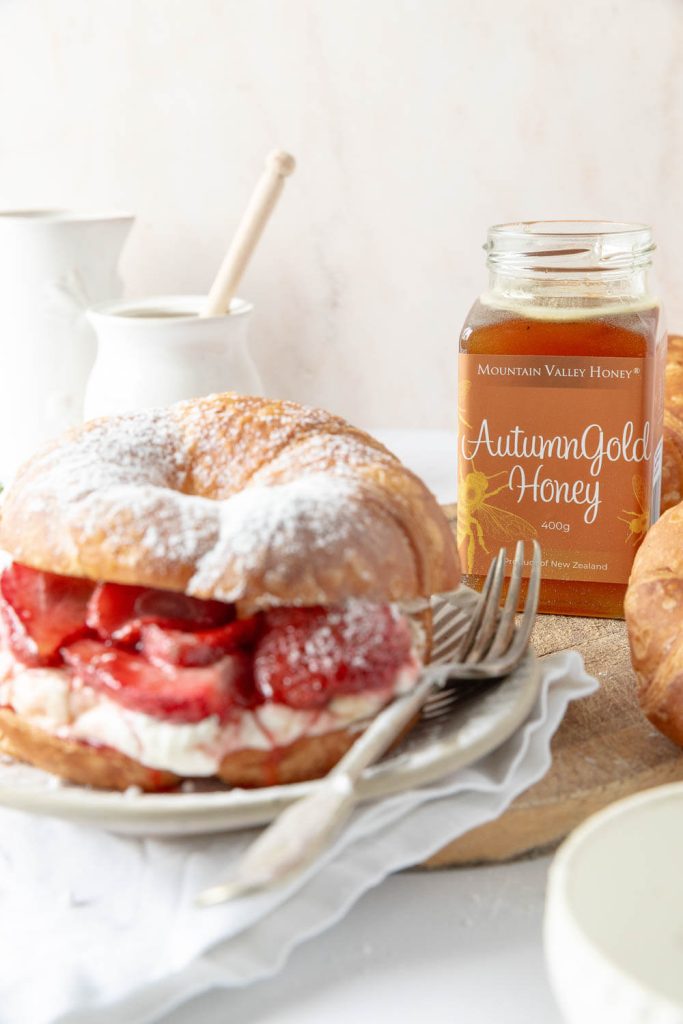 Indulge in the delights of this roasted strawberry and whipped ricotta croissants recipe with our Autumn Gold Honey. Perfect for a luxurious breakfast or brunch. Experience the union of warm, flaky croissants embracing creamy whipped ricotta infused with vanilla and topped with succulent roasted strawberries. Drizzled with the golden sweetness of Autumn Gold Honey, this recipe brings a touch of elegance to your table. Whether treating yourself on a leisurely weekend morning or impressing loved ones with a delectable treat, these croissants offer a symphony of tastes that capture the essence of comfort and decadence.