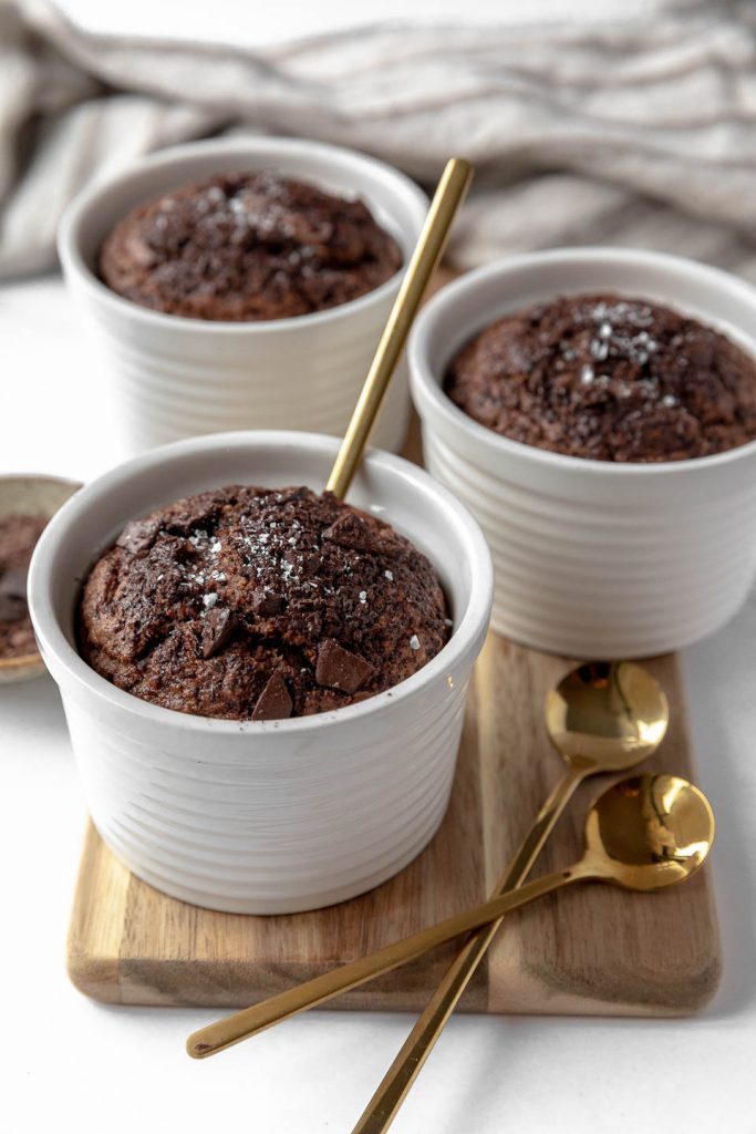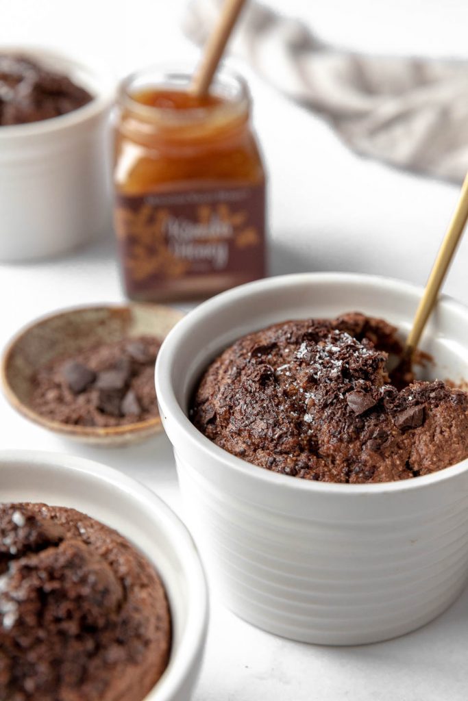 - Pour into the ramekin and sprinkle with the grated chocolate. Bake for 20-25 minutes or until a skewer inserted comes out with a few crumbs.