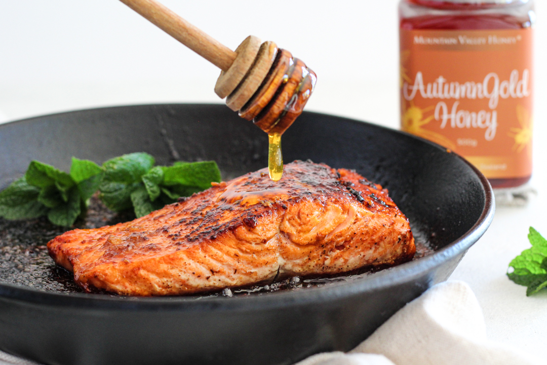Ingredients 2 cloves of garlic, crushed2 Tbsp of MVH Autumn Gold Honey½ Tbsp soy sauce1 Tbsp lemon juice½ Tbsp olive oil1 Tbsp butter2 salmon fillets, skin on¼ tsp smoked paprikaSalt and pepper Method In a small bowl, mix together the garlic, honey, soy sauce, and lemon juice and put aside.Heat the oil and butter in a cast-iron pan over a medium-high heat.Mix together the smoked paprika, salt and pepper then rub over the flesh of the salmon.Cook the fillets for 4-5 minutes.Turn the fillets and pour the sauce made earlier over the top. Continue to spoon the sauce from the pan over the fillets while they cook for another minute.Remove from the pan and serve on a bed of rice with some shaved spring onion and a side of greens.