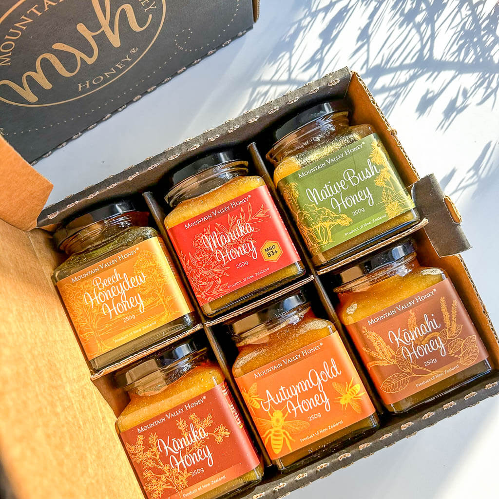 Taste the beauty of New Zealand with this six honey taster pack showcasing a variety of NZ flora.